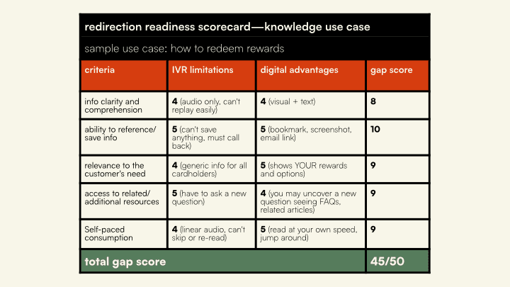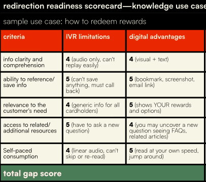 To figure out which use cases were ready for digital redirection, I developed Redirection Readiness Scorecards — a quantifiable framework that any team could use to evaluate whether a particular task was a good candidate.