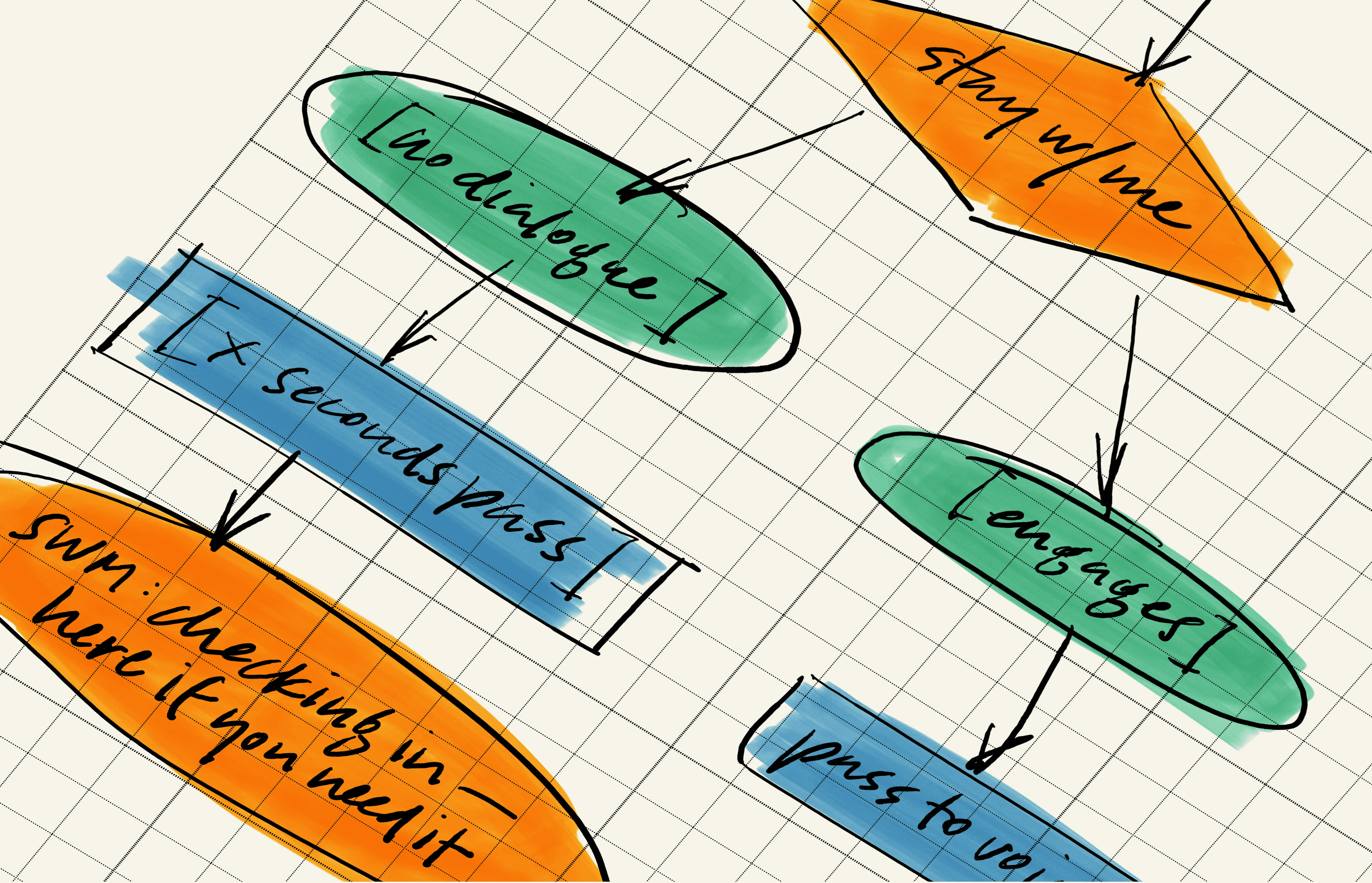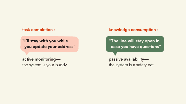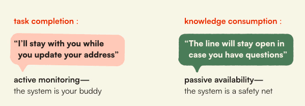 For knowledge consumption — like reading a policy article — the IVR says: “The line will stay open in case you have questions.” Passive availability. The system is a safety net, not a supervisor.